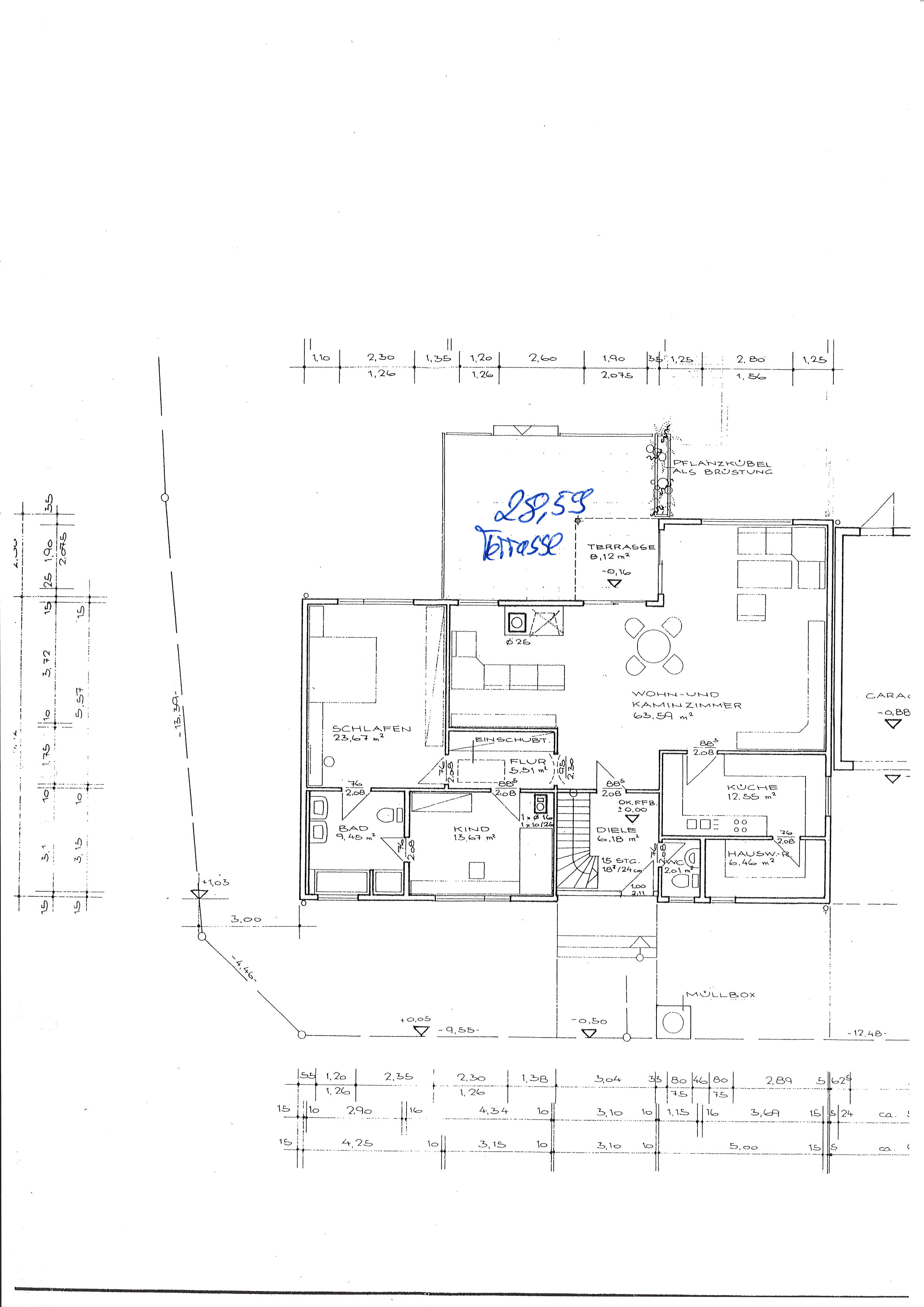 63,59 m², Bodenbelag: Fliesen, Wandbelag: Rauputz, Holzdecke weiß, Iso-Holzfenster weiß mit integrierten Strahlern, Terrassentüre aus Alu (1984), Kamin, Zugang zu Küche/Flur/Diele/Terrasse.